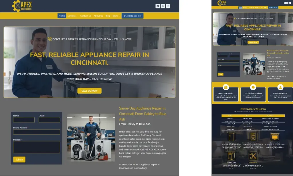 I built a clean, SEO-optimized website for Apex Appliances, a trusted appliance repair company in Cincinnati appliancerepaircincinnatioh.com. The site features service details, customer reviews, and easy contact options to help homeowners quickly schedule repairs. Designed with a focus on local SEO, mobile responsiveness, and fast performance to attract and convert local customers.