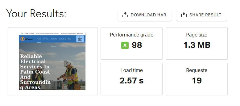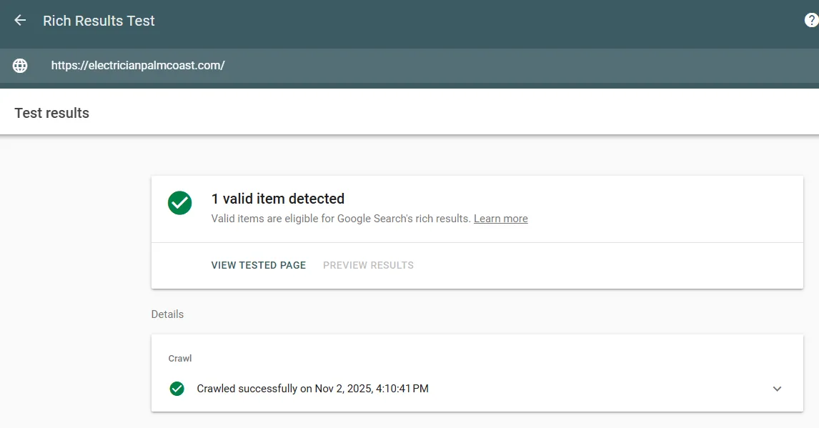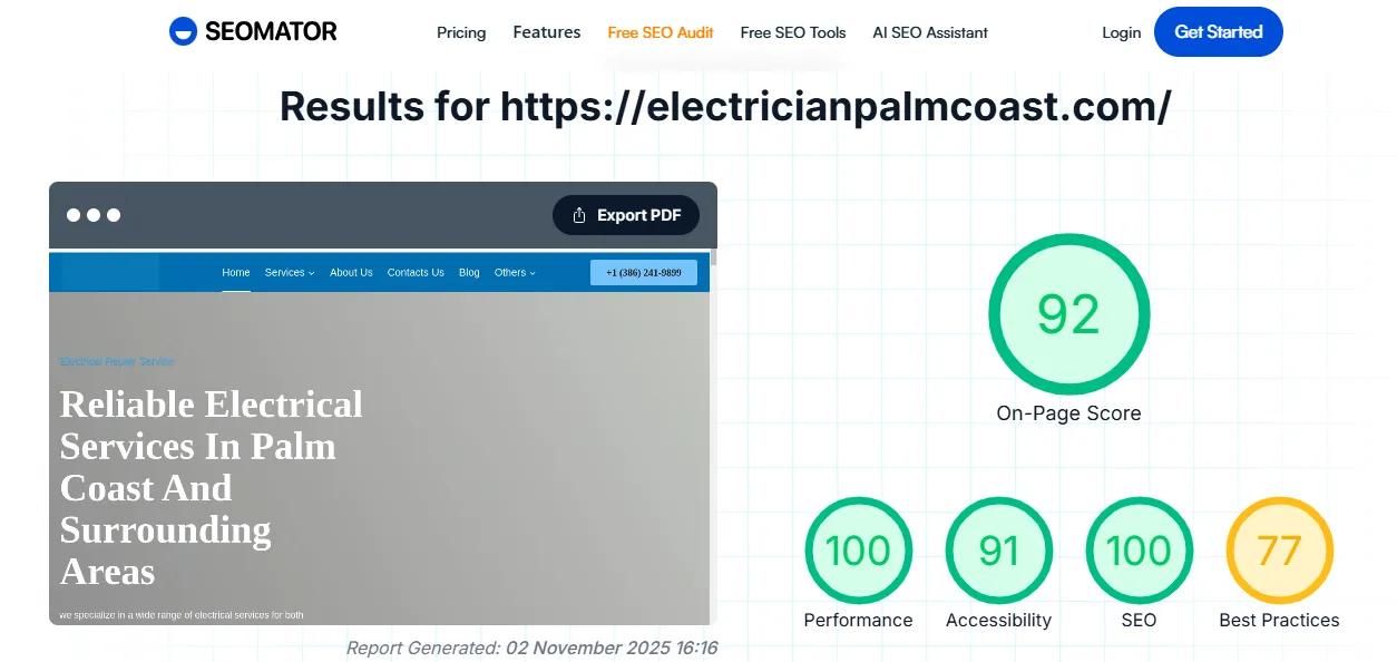 ElectricianPalmCoast.com – A fast, SEO-optimized WordPress site for a local electrical company. Achieved 98/100 performance and 92/100 on-page SEO with validated schema in Google Rich Results. Features strong technical and on-site SEO, including optimized Core Web Vitals, structured data, and mobile-first design.